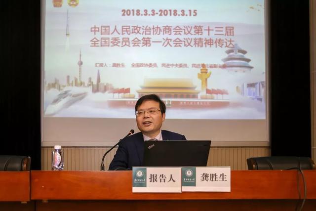 龚胜生从开幕式、大会基本情况、分组审议讨论情况及关于促进经济社会持续健康发展的主要意见建议、闭幕式等几个方面传达了第十三届全国政协会议精神。他表示,此次会议作为换届大会,政治性强、议题重大、领导重视,委员参政议政热情高,通过精心组织、周密安排,各项工作有力有序有效推进,是一个民主团结求实奋进的大会。