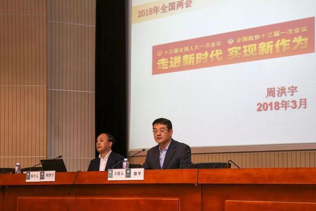 周洪宇从两会概况、《宪法修正案》的主要精神、《监察法》的主要精神、政府工作报告、国务院机构改革、大会选举、代表委员建言与两会焦点、会议热点等几个方面结合个人履职经历传达了“两会”重要精神。他表示,本次“两会”是一次走进新时代的大会,一次开启新征程的大会,也是一次展现新风貌的大会。