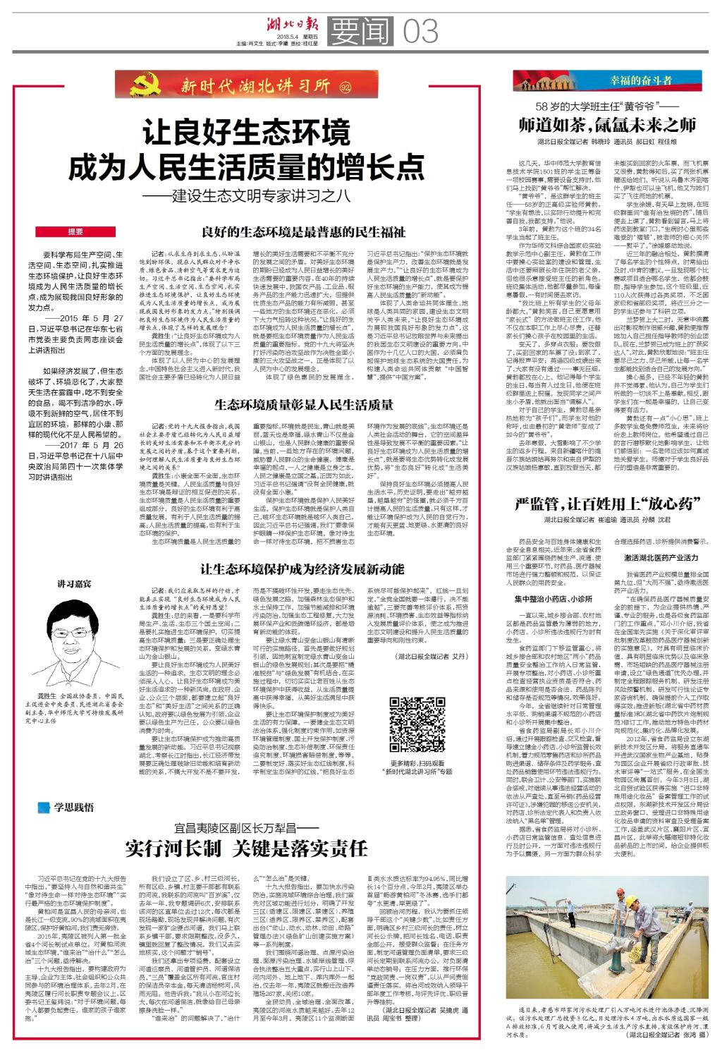 龚胜生:总的来看,一是要科学布局生产、生活、生态三个国土空间;二是要扎实推进生态环境保护,切实提高生态环境质量;三是要正确处理生态环境保护和发展的关系,变绿水青山为金山银山。