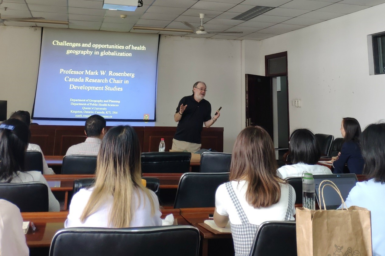 Mark W. Rosenberg教授从社会公正性、人口结构变化、环境的变化、城市的变化、健康和卫生保健的问题和挑战等五个方面对全球化与健康地理问题展开了讲解,对全球健康的不平等性、儿童死亡率、因吸烟、水资源破坏等环境恶化引发的对人类健康的消极影响以及全球化发展下疾病的传播、高人口密度、快速的老龄化等方面进行了重点讲解,进一步加强了大家对全球化与健康地理的了解。讲座的互动环节,老师们、同学们与Rosenberg教授就流浪人口归属性、敏感性疾病的政府管理等方面进行了交流。Rosenberg教授以简洁明朗、风趣幽默、深入浅出的讲解方式,使大家深受感染、受益良多。