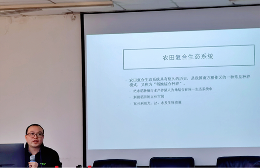 第一阶段,于雷副教授作了主题为“乡村城镇化过程中稻虾种养的利与弊”的学术报告。他详细阐释了将水稻种植与水产养殖结合在同一生态系统中的虾稻种养模式,并指出由于该种养模式提高了稻田的经济效益,越来越多的年轻人愿意留在乡村进行虾稻种养,这导致本研究试验区域水稻田耕地面积逐渐增加,让我们对乡村人口回流、土地规划等问题有了新的思考。同时他强调,随着稻虾种养的耕地范围不断扩大,品牌效应及产业链的问题仍需继续完善创新。最后,于雷老师基于地理学视角,阐释了虾稻种养模式也面临水资源的耗费,排灌设施完善,对抗市场风险,合理规划布局等一系列挑战。